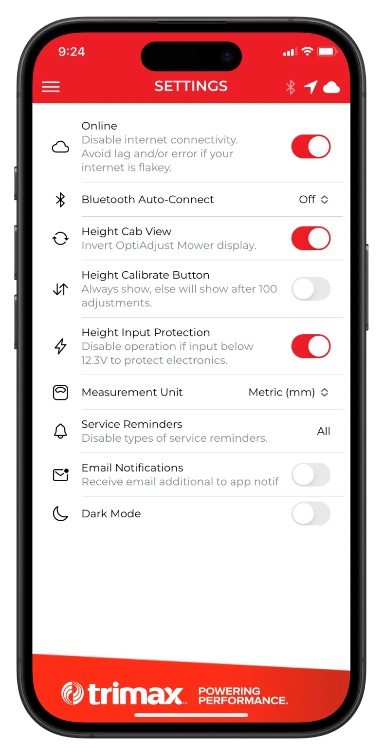 Designed for Snake & Pegasus owner/operators with MLS / OptiAdjust: analyze mower run time, control the Multi-Lift System (MLS) & Trimax OptiAdjust.