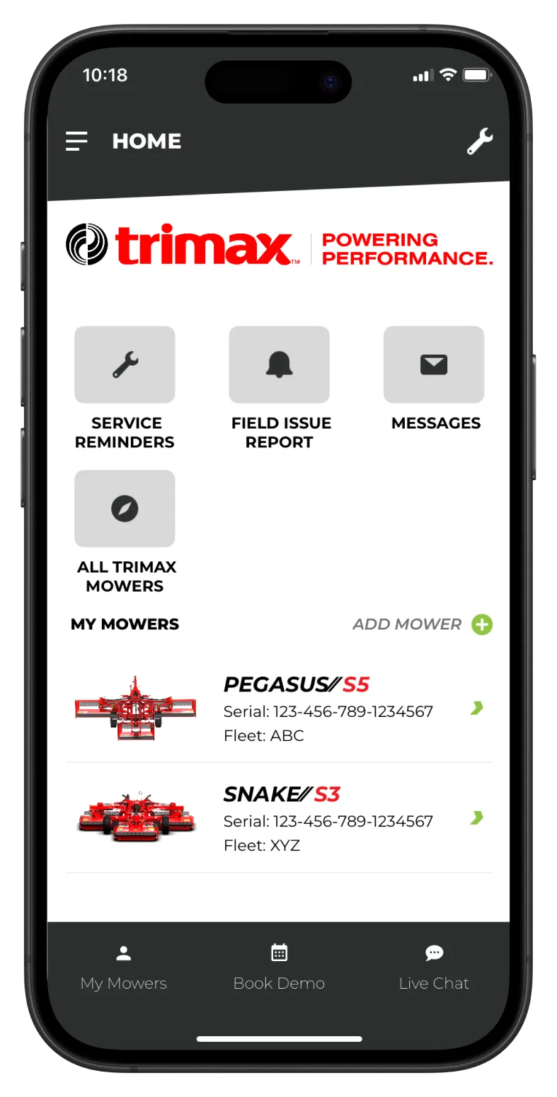 Designed for all Trimax owner/operators: manage, maintain and maximize your Trimax mower with service tools, resources and live chat support.