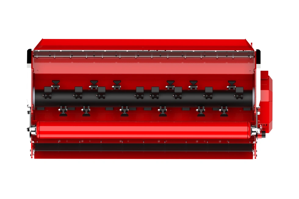 A flail mower operates quite differently. Instead of a single blade, it uses a horizontal rotor fitted with multiple Y-flails or blades spread across the full width of the mower. As the rotor spins, these flails cut and process the material repeatedly before discharging it.